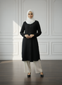 Our modest black tunic  crafted from a lightweight, flowy, and wrinkle-free fabric that keeps you cool and comfortable throughout the day. Designed with a smooth button-down front, it features a graceful rounded side cut that adds subtle movement to the silhouette. The elasticated gathers at the back waist create a naturally shaped, easy fit without appearing tight. Elegant, practical, and effortlessly stylish—perfect for everyday wear, work, or casual outings.