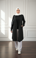 A versatile long black shirt featuring subtle white line detailing that adds a modern, stylish touch. The lines are arranged in vertical and horizontal pattern to give it a unique look. Designed for flexibility, it can be worn buttoned up for a sleek, polished look or left open over a t-shirt for a smart, layered style. Its effortlessly chic design makes it a perfect choice for college students who love a trendy yet modest outfit, as well as office-goers who prefer a professional and comfortable everyday look.